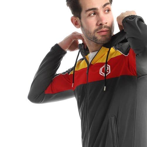 Men's training suit with hooded neck—